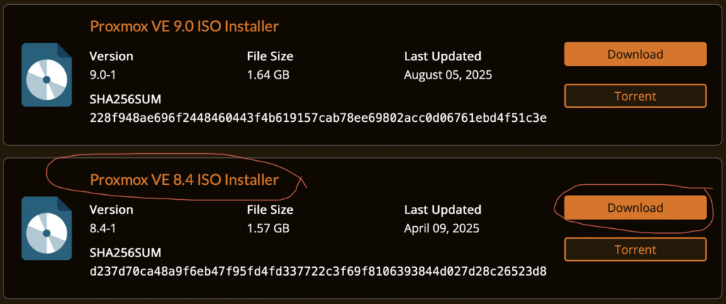 First Head over to the product download website and download a copy of the Proxmox VE 8.4 ISO Installer (this Version of Proxmox allows for easy and automatic set up or installation of various VM’s and containers using scripts, you can also easily update it to the latest version after installation) or the latest Proxmox VE 9 ISO installer (as at the time of writing this guide Proxmox version 9 was rather still new and full scripting support is not yet updated). This is the installation file we will be using for both PC x86 & MacOSX installations.