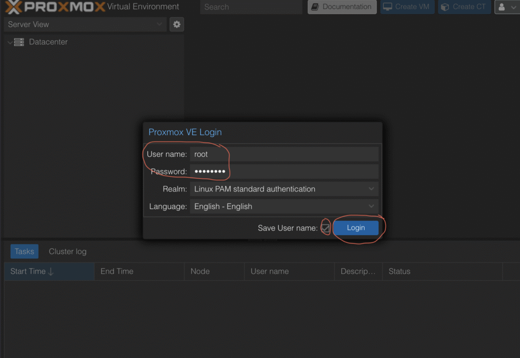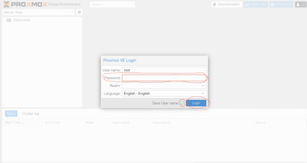 Copy the webpage address and open it up in a new browser tab, once it is open follow the guide in the picture above to open up the login page where you input your username and password. Below is a screenshot of the login page for Proxmox GUI,
