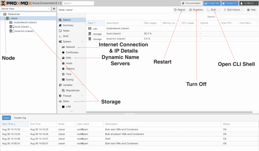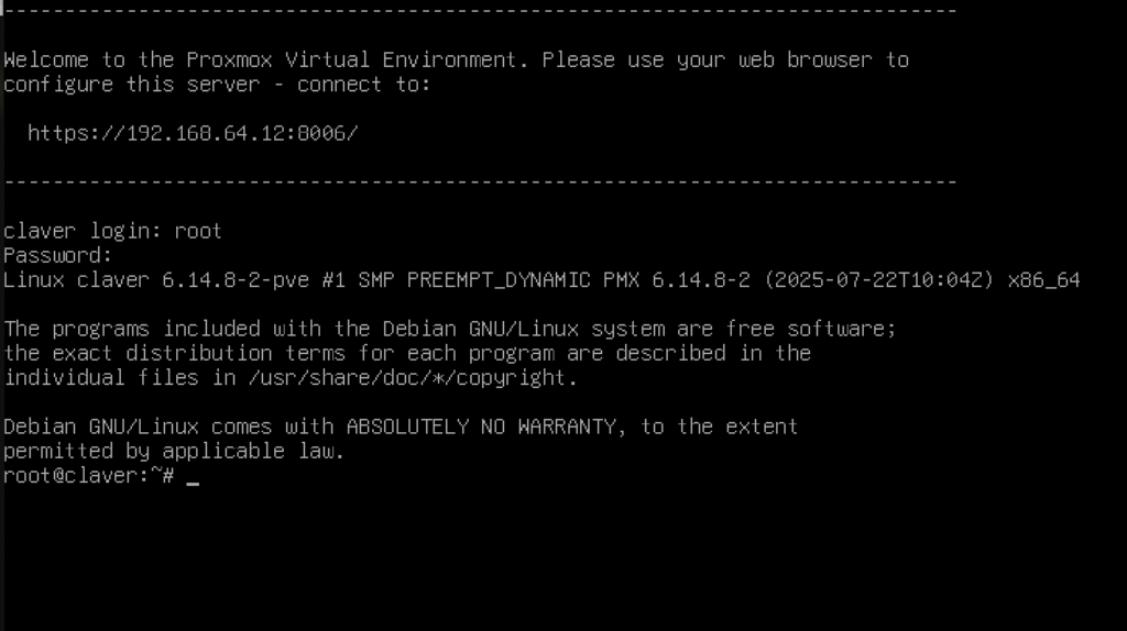 - You can also head over to the Proxmox GUI administration webpage which can be found on your CLI window before/after you are requested to login. Take a look at my own administrative webpage address below,