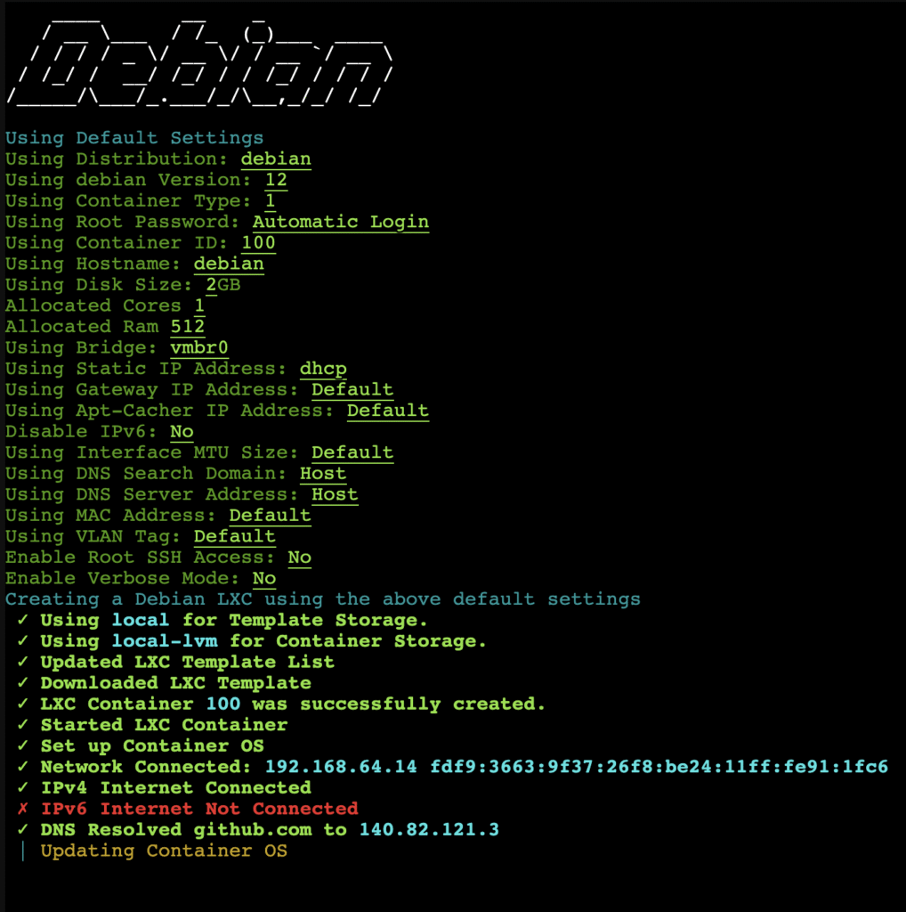 Installation is very quick and you will be able to track its progress via Proxmox Shell CLI, here are my screenshots after installing Debian and Ubuntu LXC Containers,