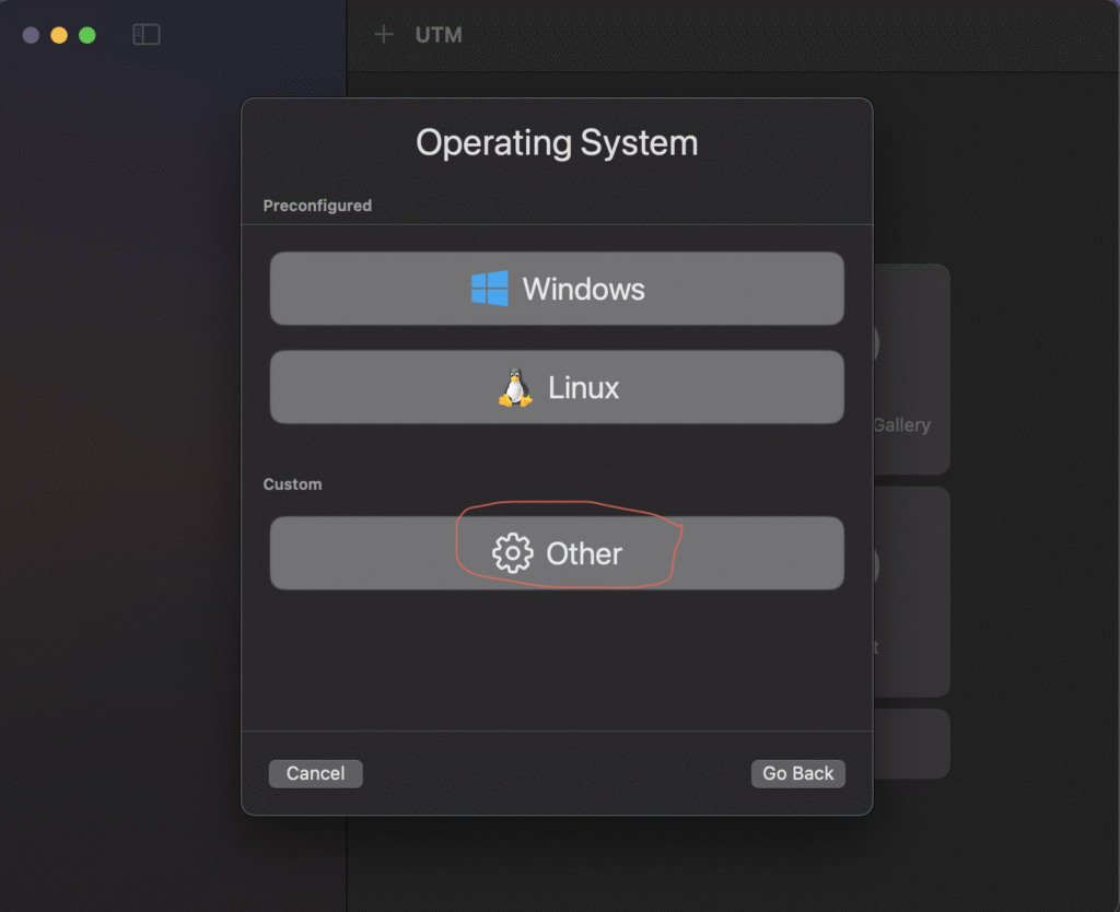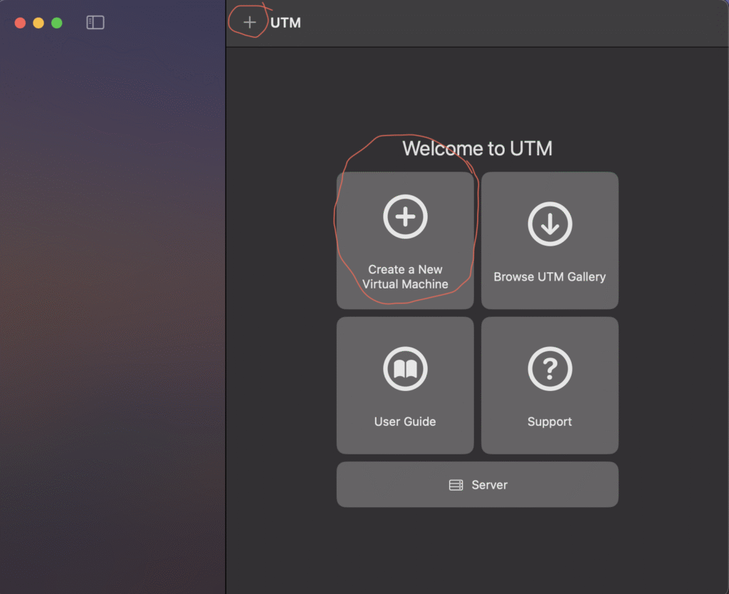 - Next click on CREATE A NEW VIRTUAL MACHINE or the plus (+) sign at the top of the UTM application,