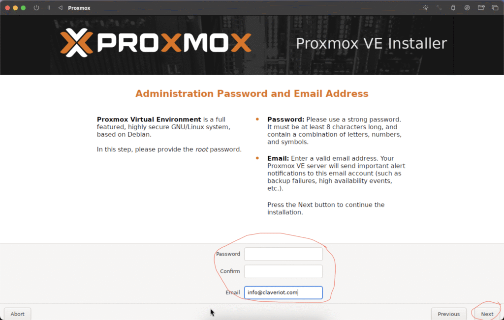 - Input your preferred password for the Proxmox application and also a valid email address to receive mails and click NEXT,