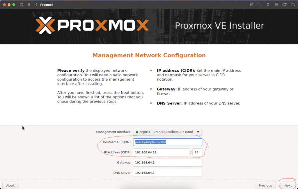 - Give your VM a host name (eg, claver.iot.pve) and verify the IP address and submit that the VM will utilize on your local network and click NEXT,
