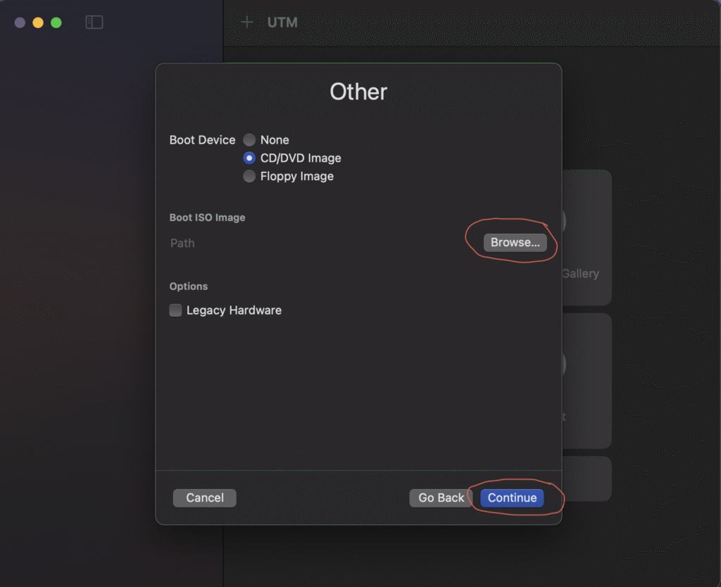 - on the ‘Other’ tab, Select BROWSE then navigate to the folder, where you have your Proxmox ISO file and select it and click CONTINUE,