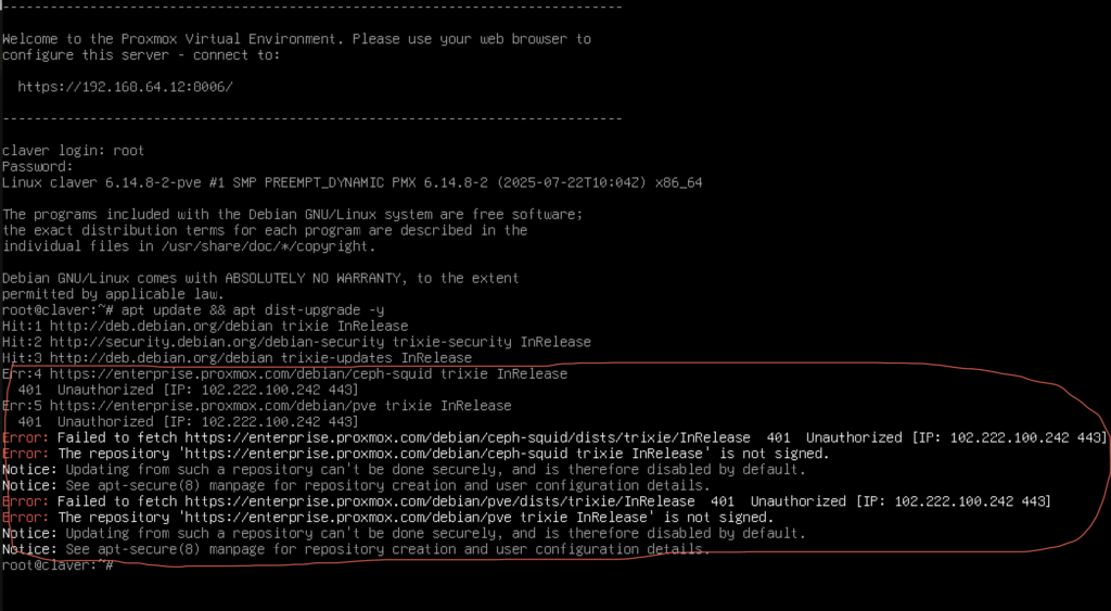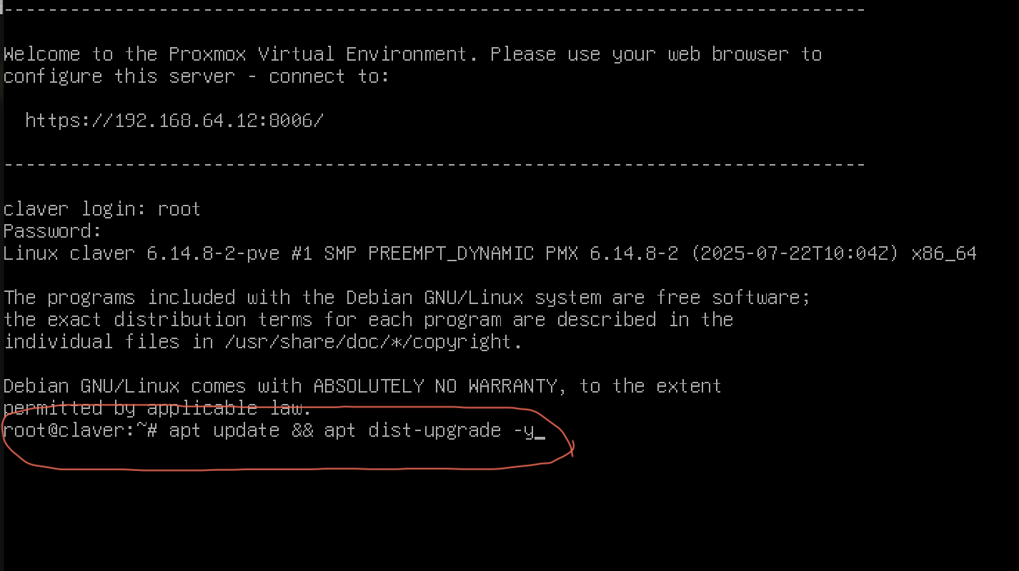 Please take note of the upgrade command on Proxmox, you should upgrade its system by using the tag ‘distāupgrade‘ (which stands for distribution upgrade) and not the normal upgrade tag that we are used to on other usual Linux operating systems. If you upgrade your Proxmox system using the normal upgrade tag you will end up breaking it (even though Proxmox is based on the linux Operating System).