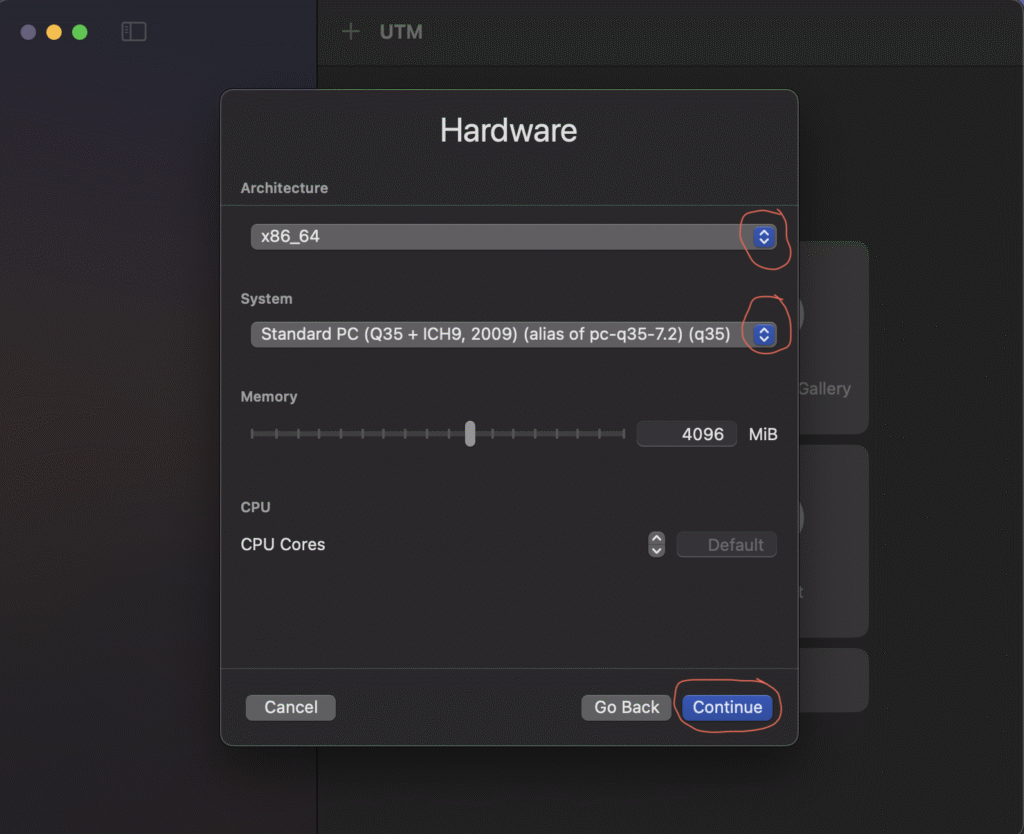 - (for Mac) on the Hardware tab, make sure you have the selections on x86_x64 and Standard PC, give the VM some RAM (4GB is good enough) and click CONTINUE,