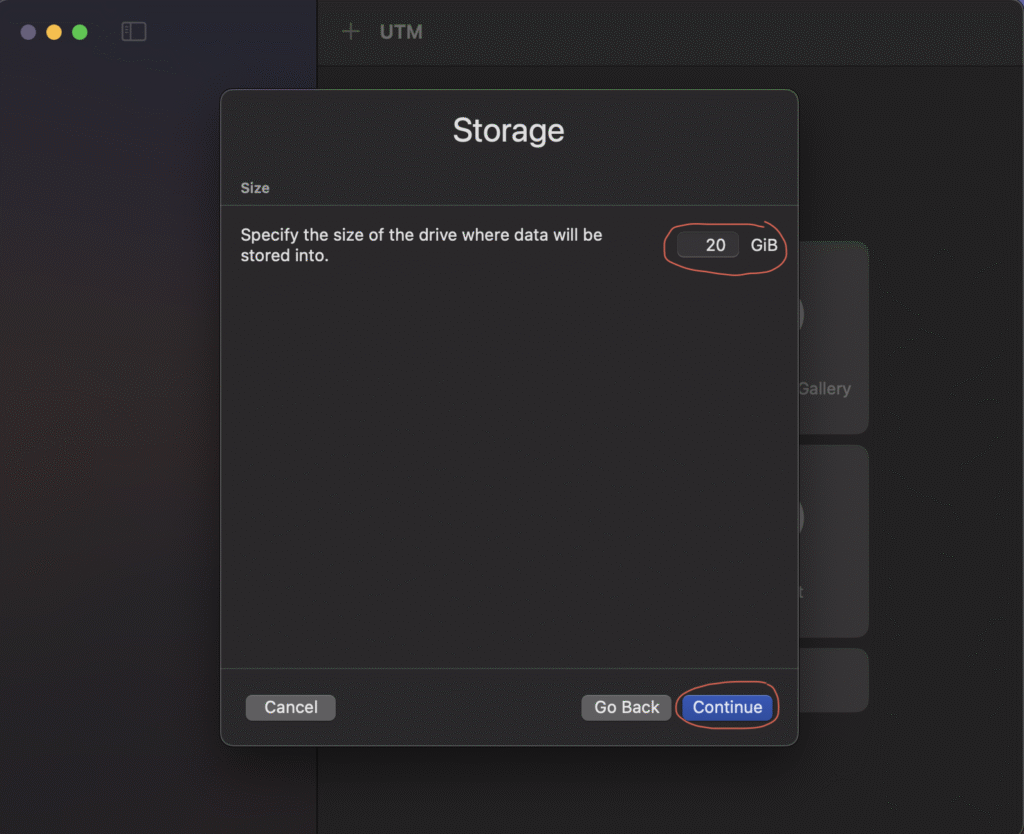 - on the Storage tab allocate HDD space to the VM (20GB is modest enough) and click CONTINUE,