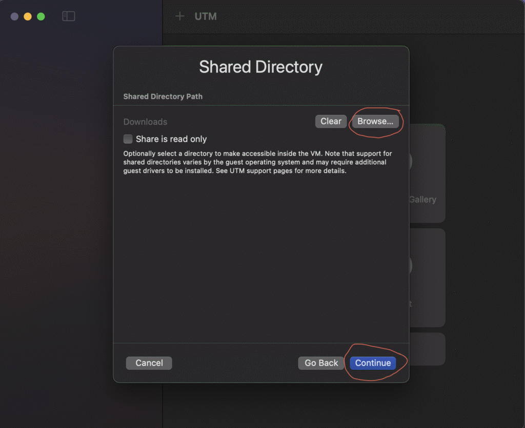 - on the Shared Directory tab click BROWSE to choose a folder on your host system that will be accessible from the VM and click CONTINUE,