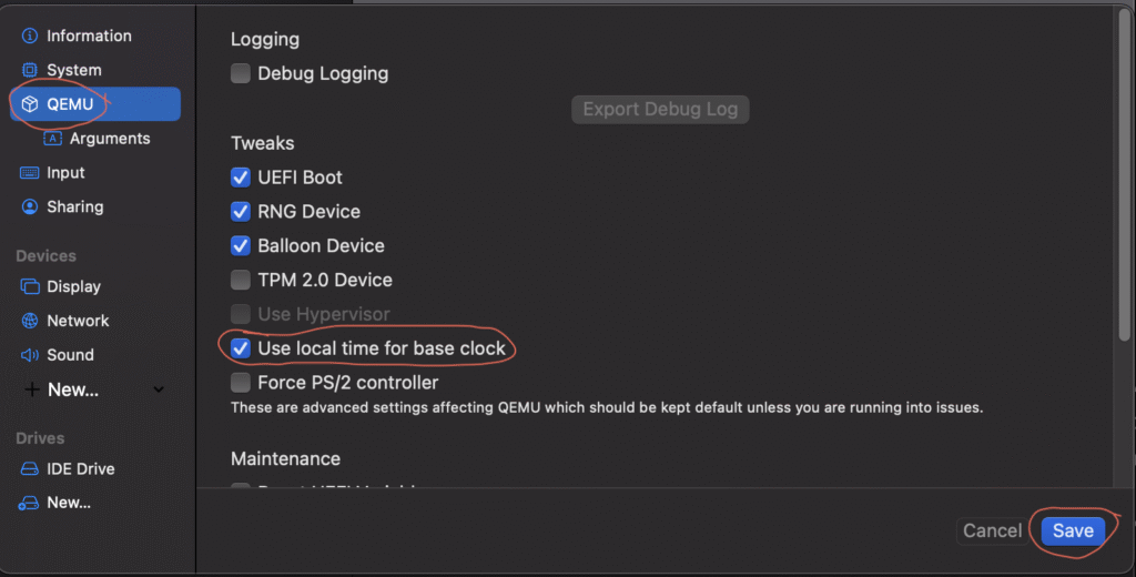 - Select the QEMU menu on the left-hand column and tick the Balloon Device & Use Local Time For Base Clock option,