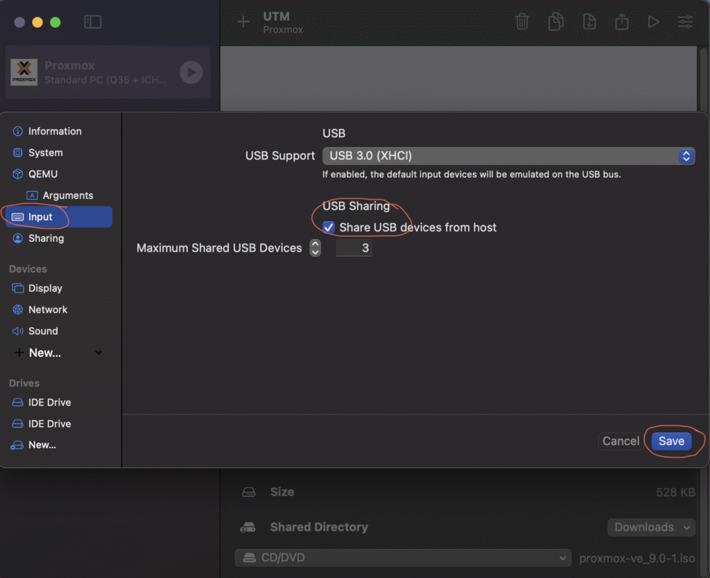 - also select the INPUT menu on the left-hand column and tick the Share USB Device From Host option,