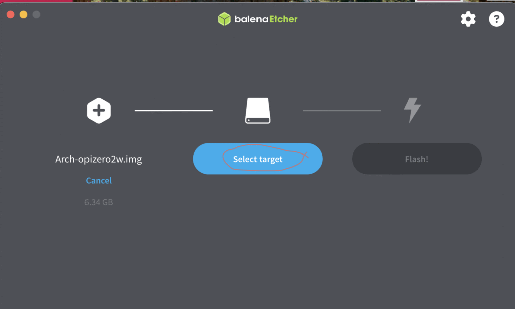 Next we click on the SELECT TARGET button to choose the removable media where we will be installing the OS we wish to flash,