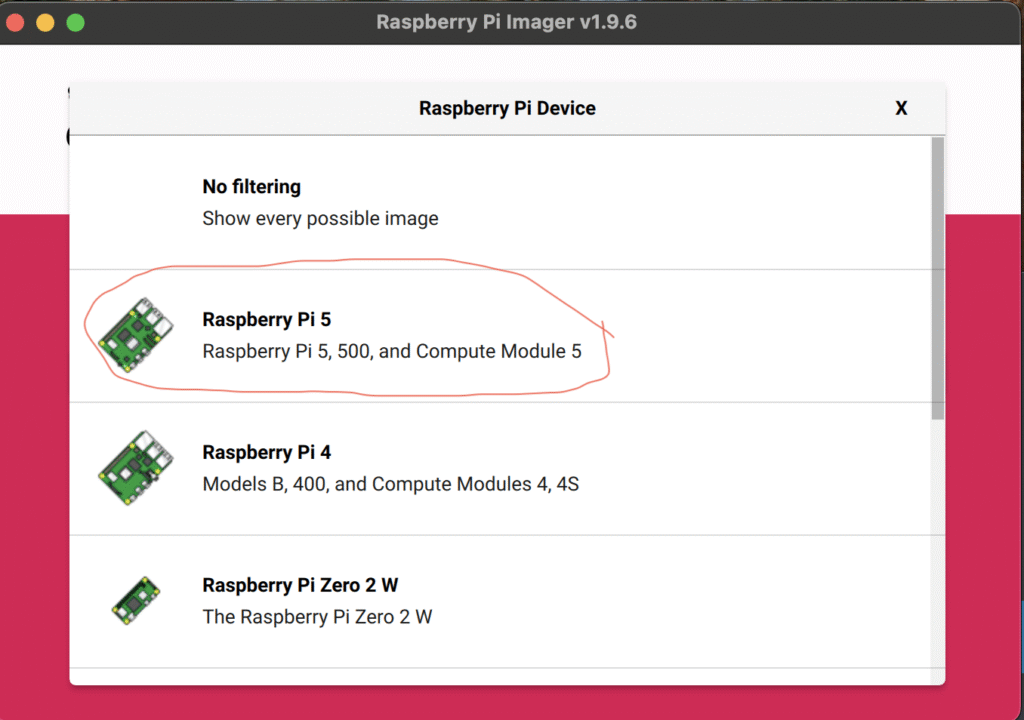 If you are flashing firmware for a non Raspberry Pi device then click the NO FILTERING option.